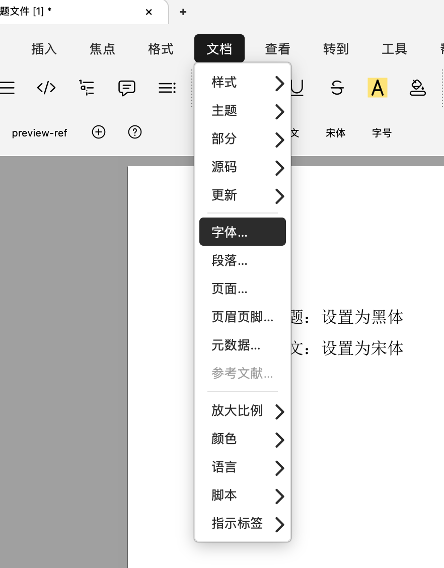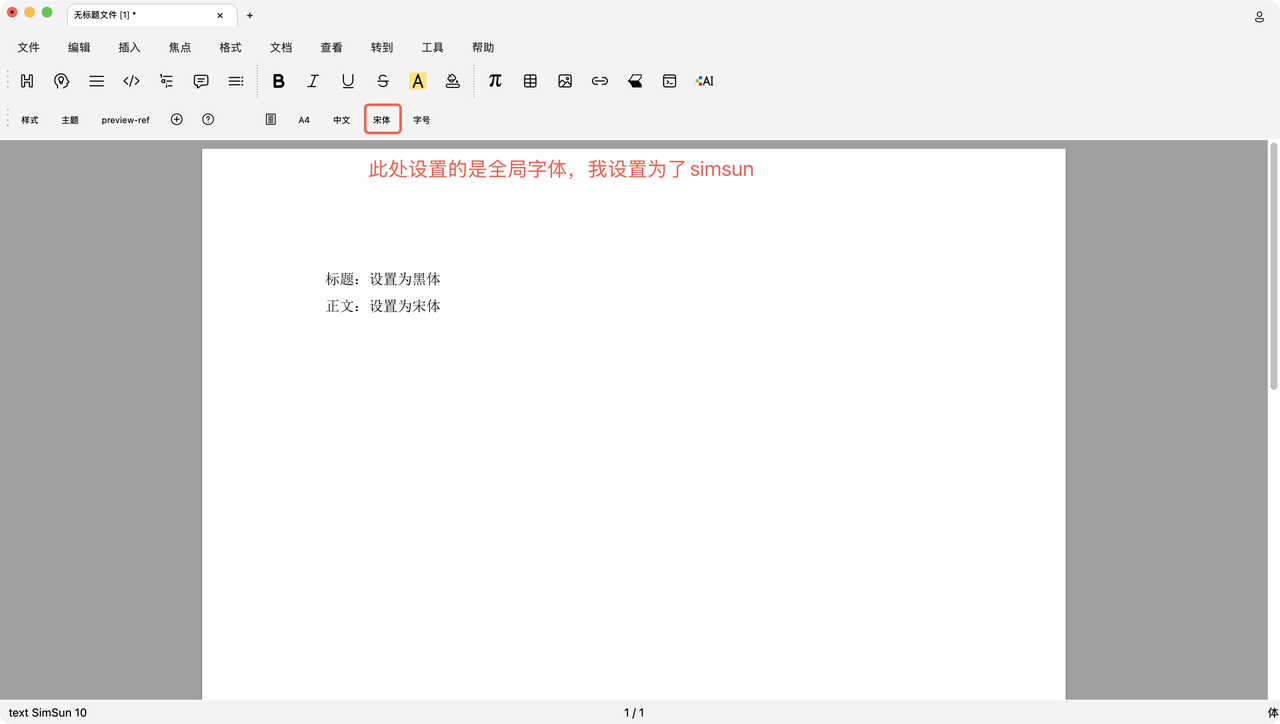 在工具栏里的字体和字号以及菜单栏里的文档->字体设置的都是全局字体和字号