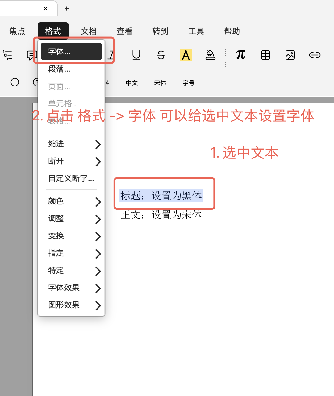 选中文本(会有蓝色背景),在格式->字体就可以给这部分文本设置单独的字体和字号了,这局部设置可以覆盖全局设置