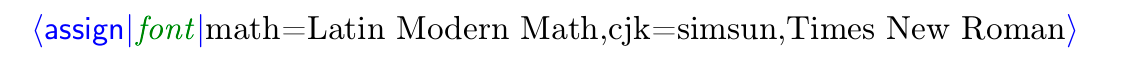 其中数学字体通过math=设置,中文字体通过cjk=设置,英文字体不需要。 可以自由更换为自己需要的字体。