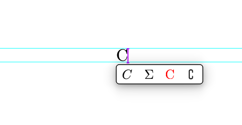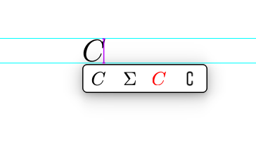 \mathcatalan显示为斜体 C。修复后\mathcatalan显示为直体 C。\mathcatalan可通过C的 Tab 循环输入。