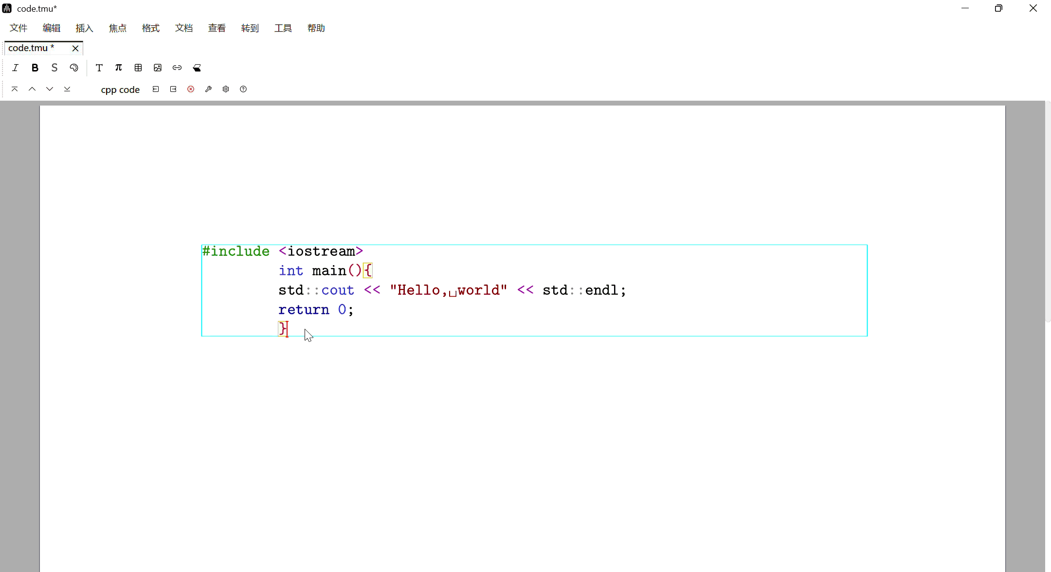 </>(插入计算机程序)->代码块,可以选择纯文本进入名为 verbatim code 的环境。如果需要排版的是 C++、Scheme 或 Shell 代码,也可以直接选择对应的选项进入相应的 cpp code、scm code 和 shell code 环境。