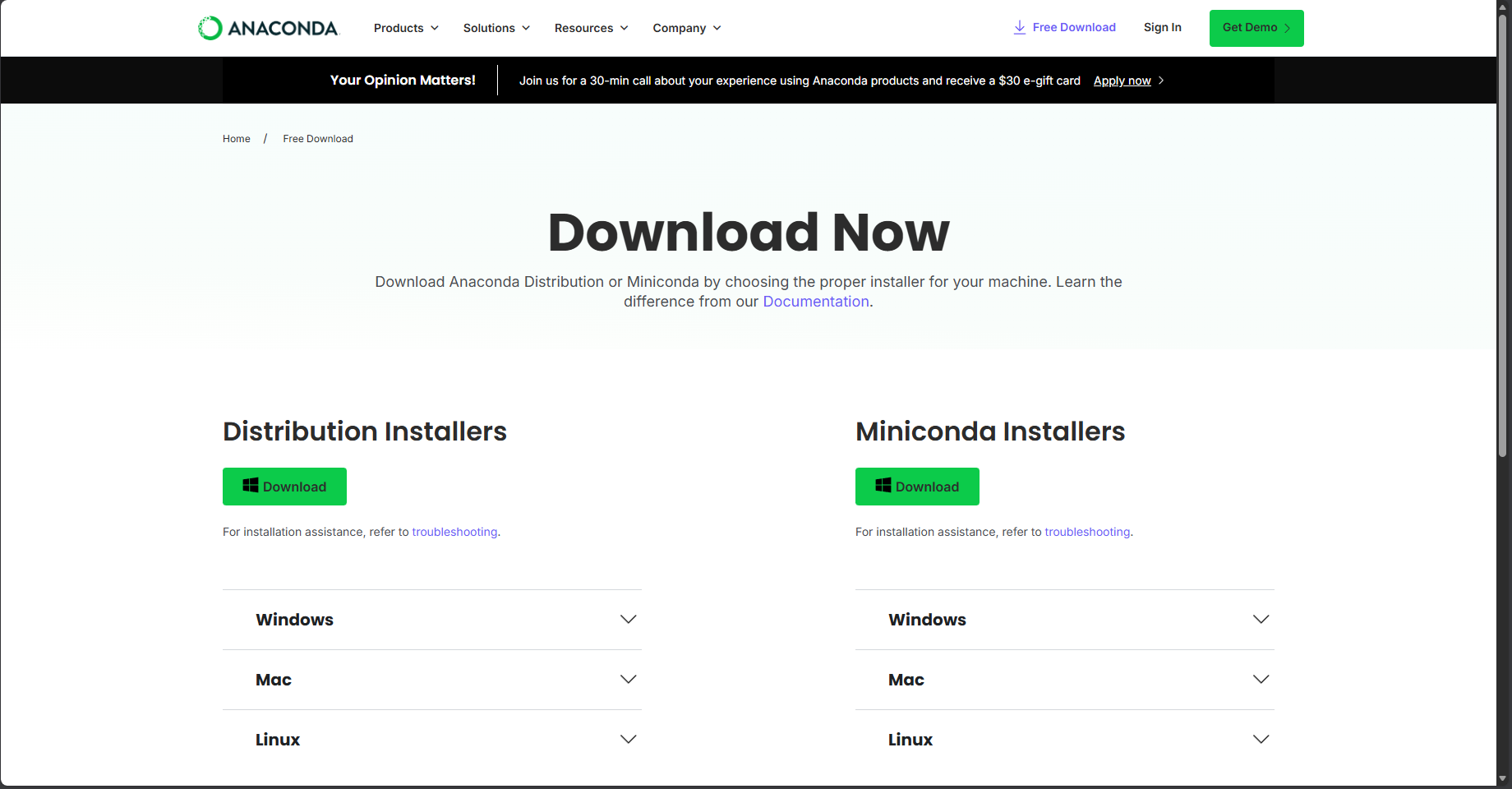前往 https://www.anaconda.com/download 进行对应系统版本安装包的下载。