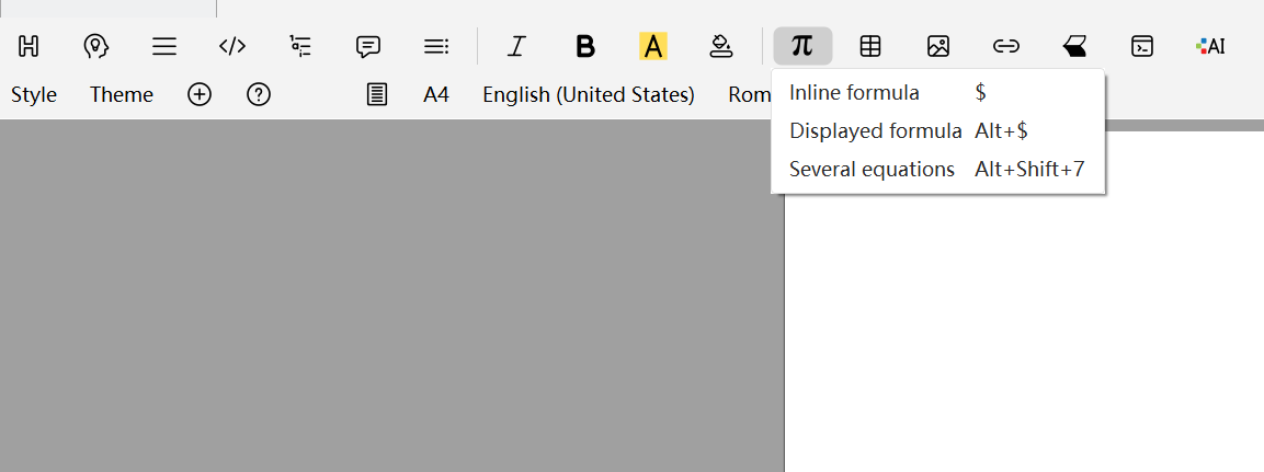在文本模式下,点击模式工具栏上的 π 按钮,可以选择插入行内公式、单行公式或多行公式。