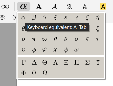 在数学模式下输入的任一字符,都可以通过 Tab 键在它的形似符号(如 A 和 ∀)或是音似的希腊字母(如 a 和 α)中循环切换。