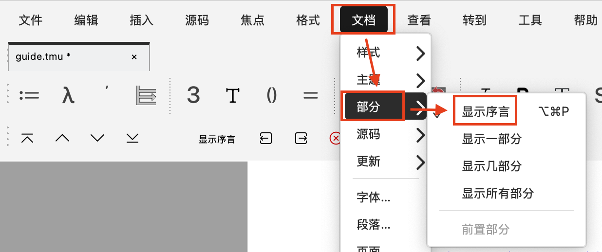 菜单栏点击 文档 → 部分 → 显示序言 。