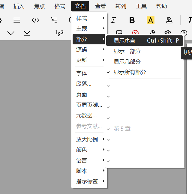 方法一:菜单栏文档 → 部分 → 显示序言。