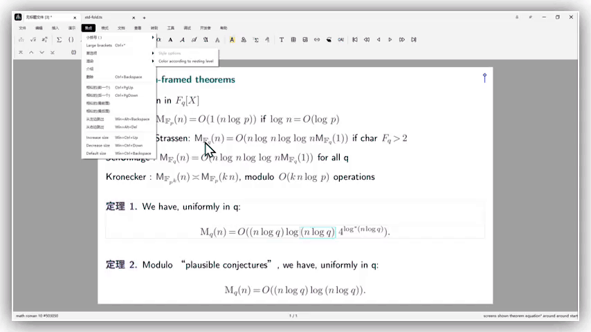 首先进入需要背景渲染的语义块,再在工具栏中点击 焦点 -> 首选项 -> 定理加框。即可对语义块进行加框操作。此操作可以让定理等语义块环境视觉上独立于其他的文字内容。(操作方式及操作前后的效果,如下图所示)
