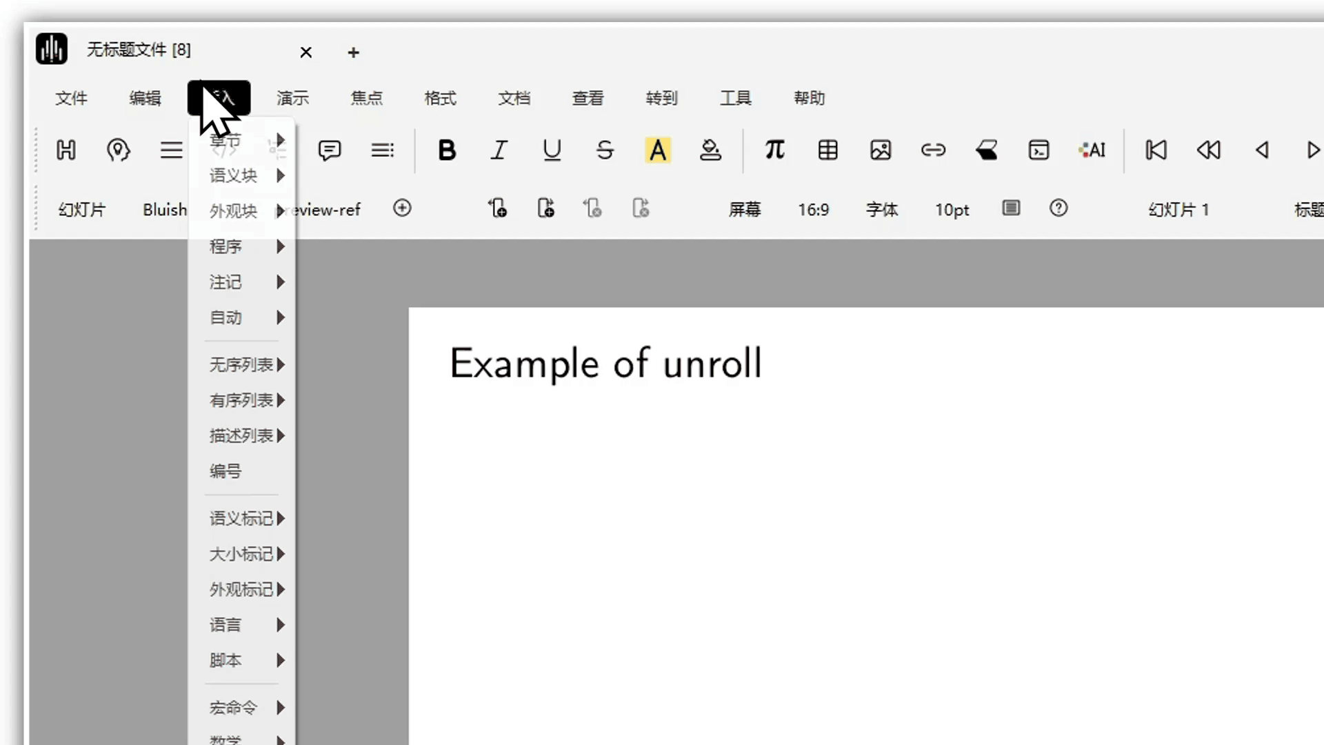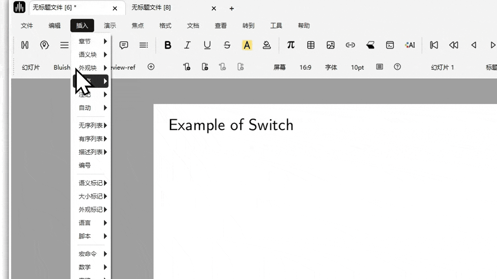 样式->beamer进入幻灯片模式。