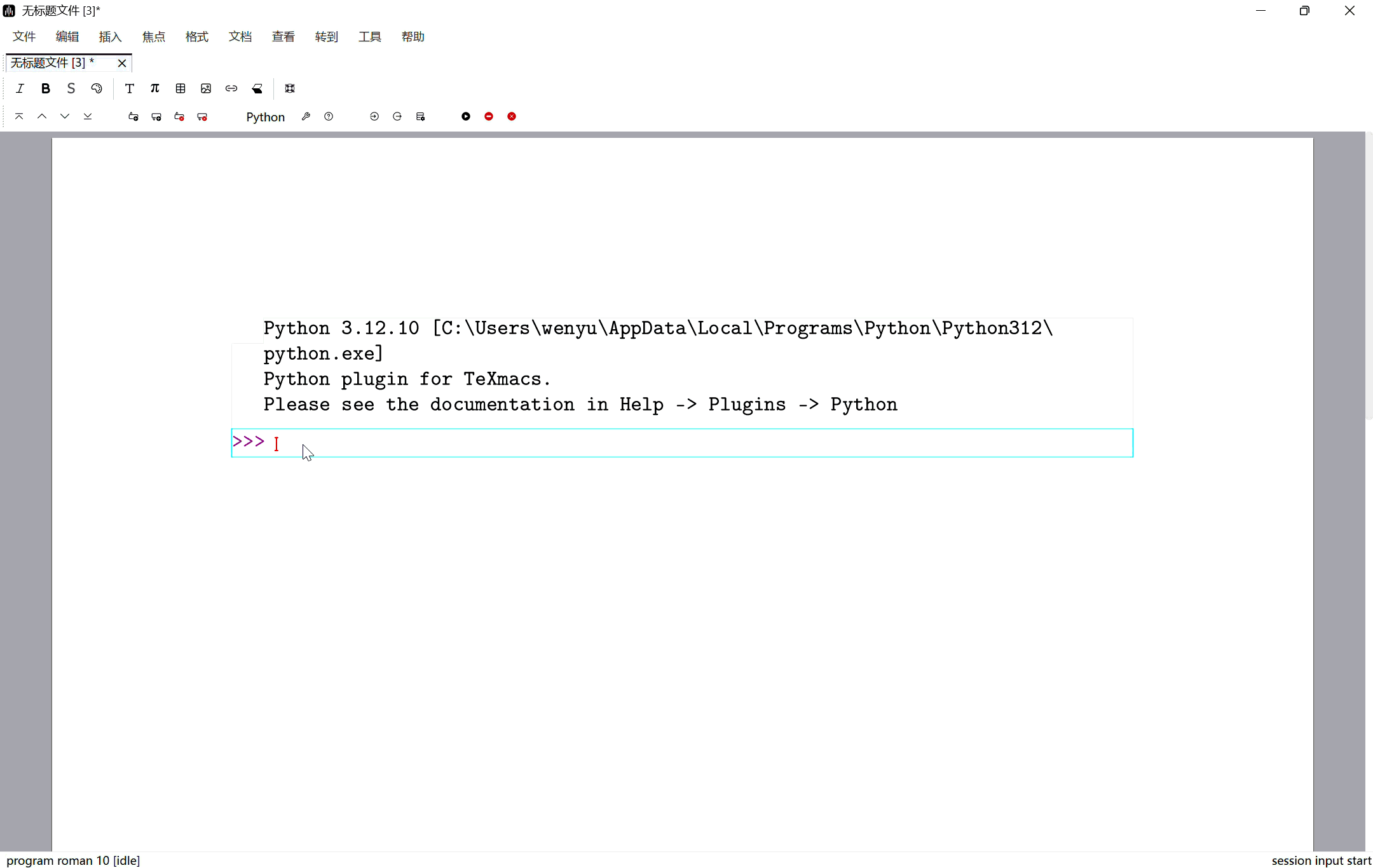 使用该功能首先需要在您的计算机上安装 Python。之后点击模式工具栏上的 插入会话 -> Python 进入可执行代码块环境。