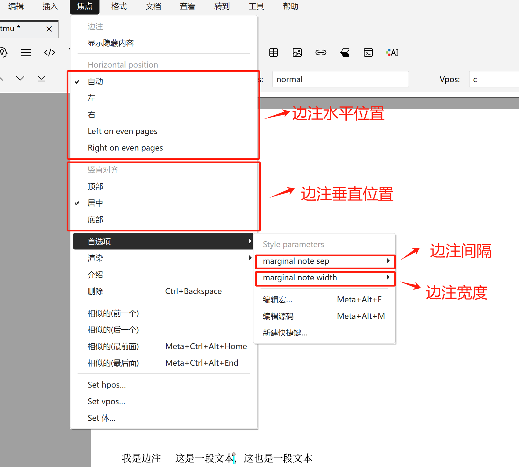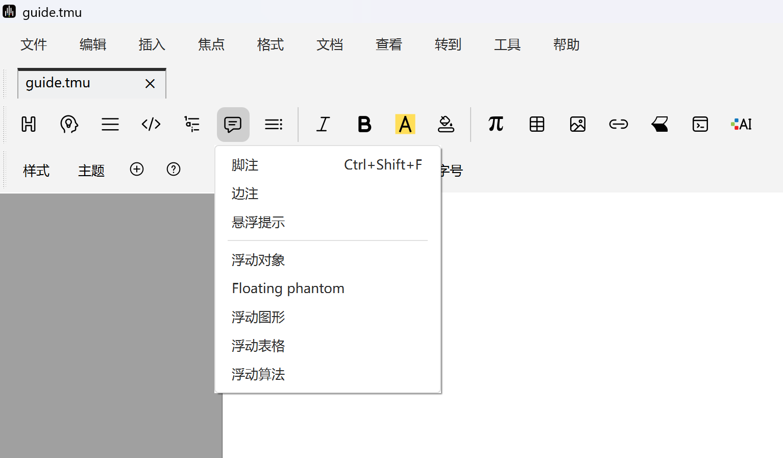 多文本流包括脚注、旁注以及浮动图形或表格,可以通过点击模式工具栏中的 插入注释或浮动对象