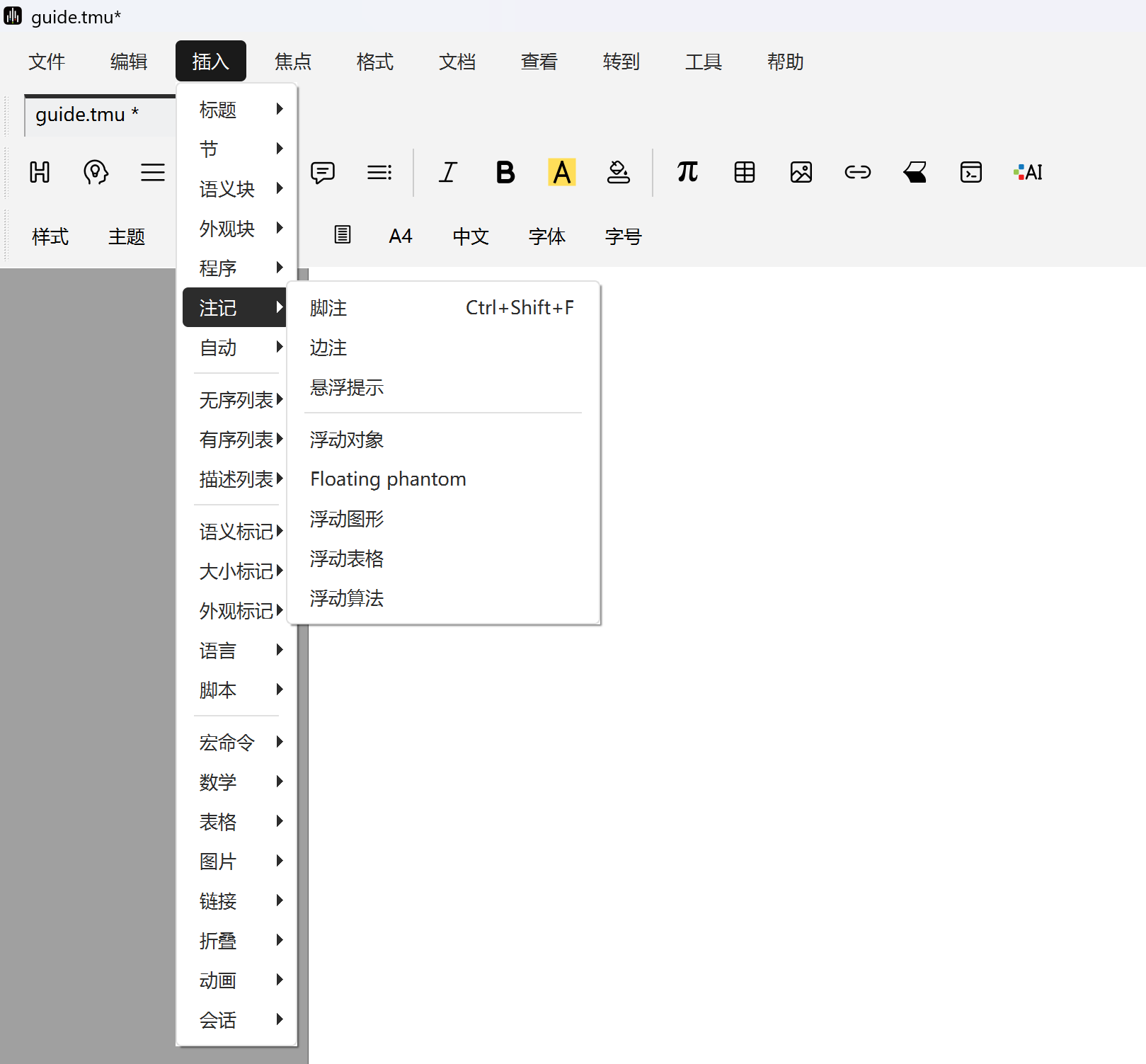 但请注意,基本脚注仅在普通文本流中有效。如果您想在表格或其他特殊标记中插入脚注,则可以在菜单栏依次点击 插入