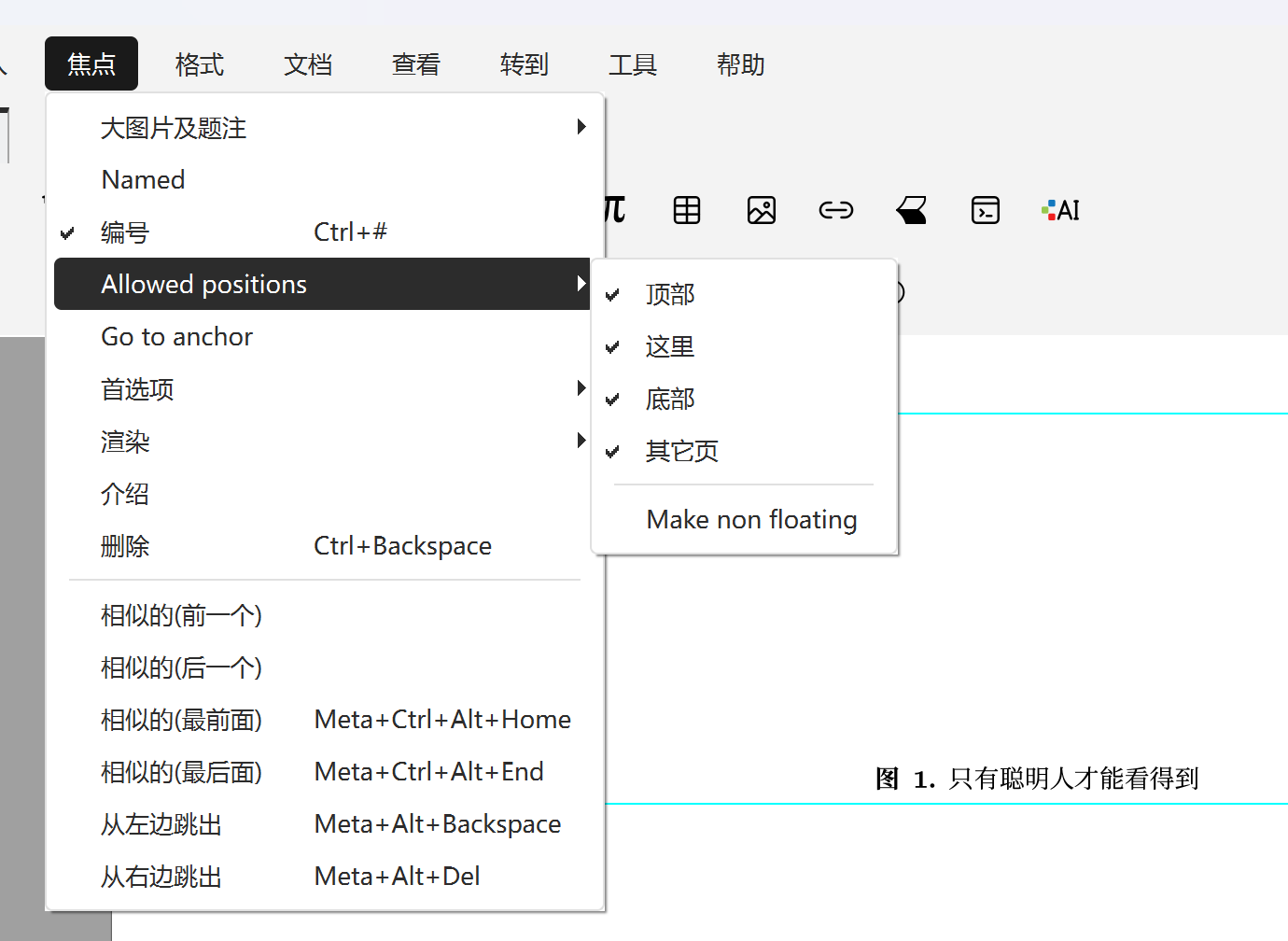 同样,排版程序倾向于将浮动对象移到同一列的顶部或底部。如果您希望为脚注或浮动对象选择不同的列数,可以通过依次点击菜单栏中的 格式