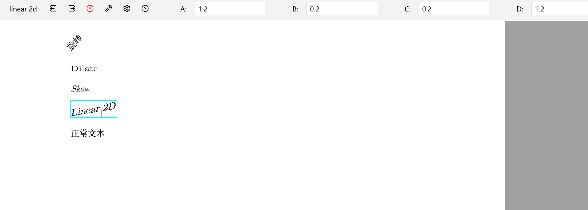 中的项目,可以对选定的文本块应用多种线性变换:旋转(Rotate)、垂直缩放(Dilate)、倾斜(Skew)以及一般的 2×2 矩阵变换。相应的参数(角度、放大因子、倾斜度和矩阵系数)可以通过环境工具栏上的字段进行输入。
