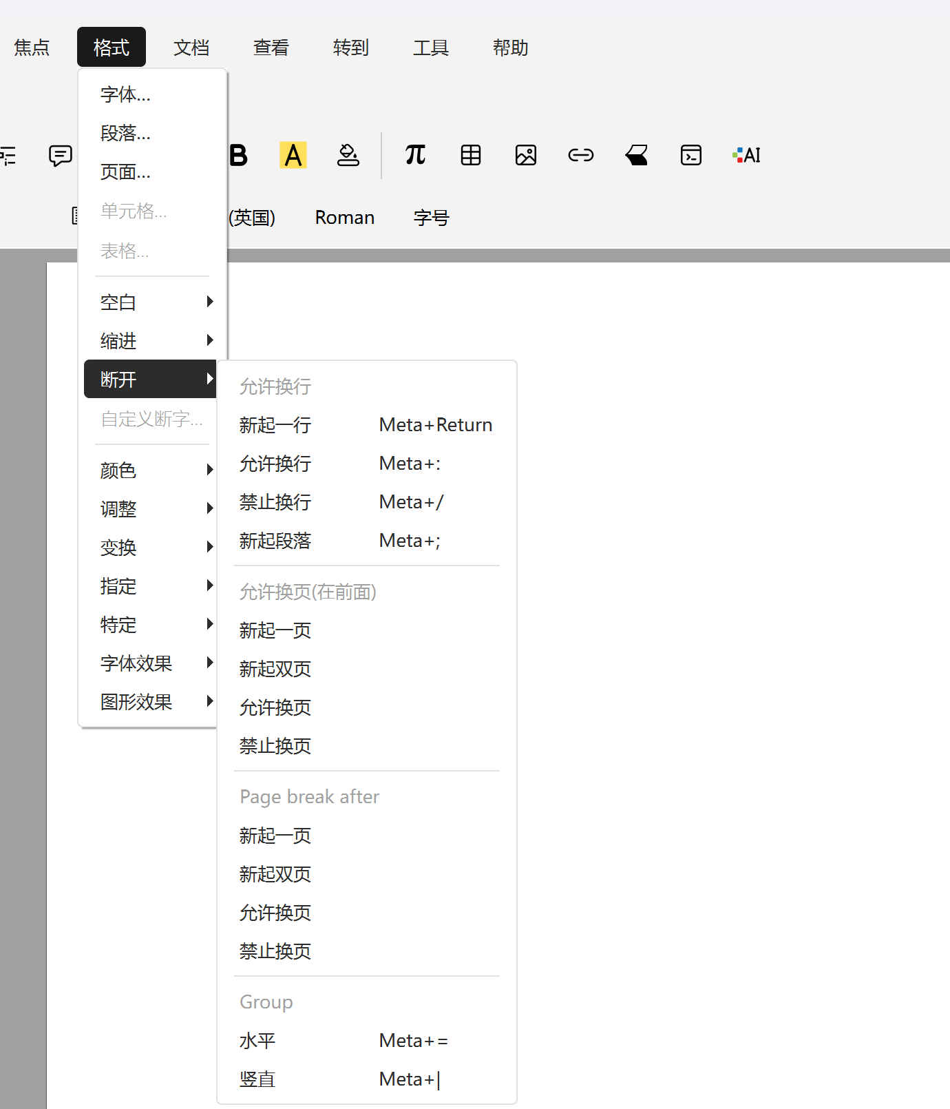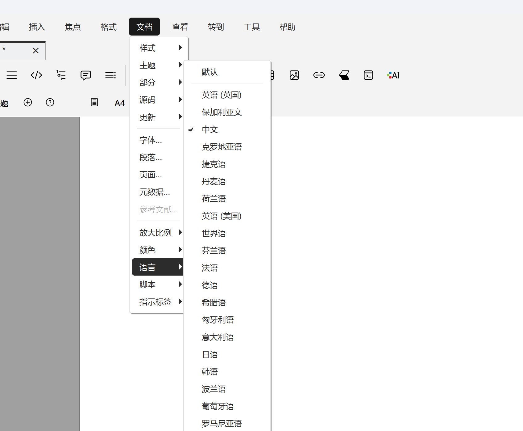 不同语言允许的连字符规则差异很大,如果您需要为文档指定正确的语言,您可以在菜单栏依次点击 文档