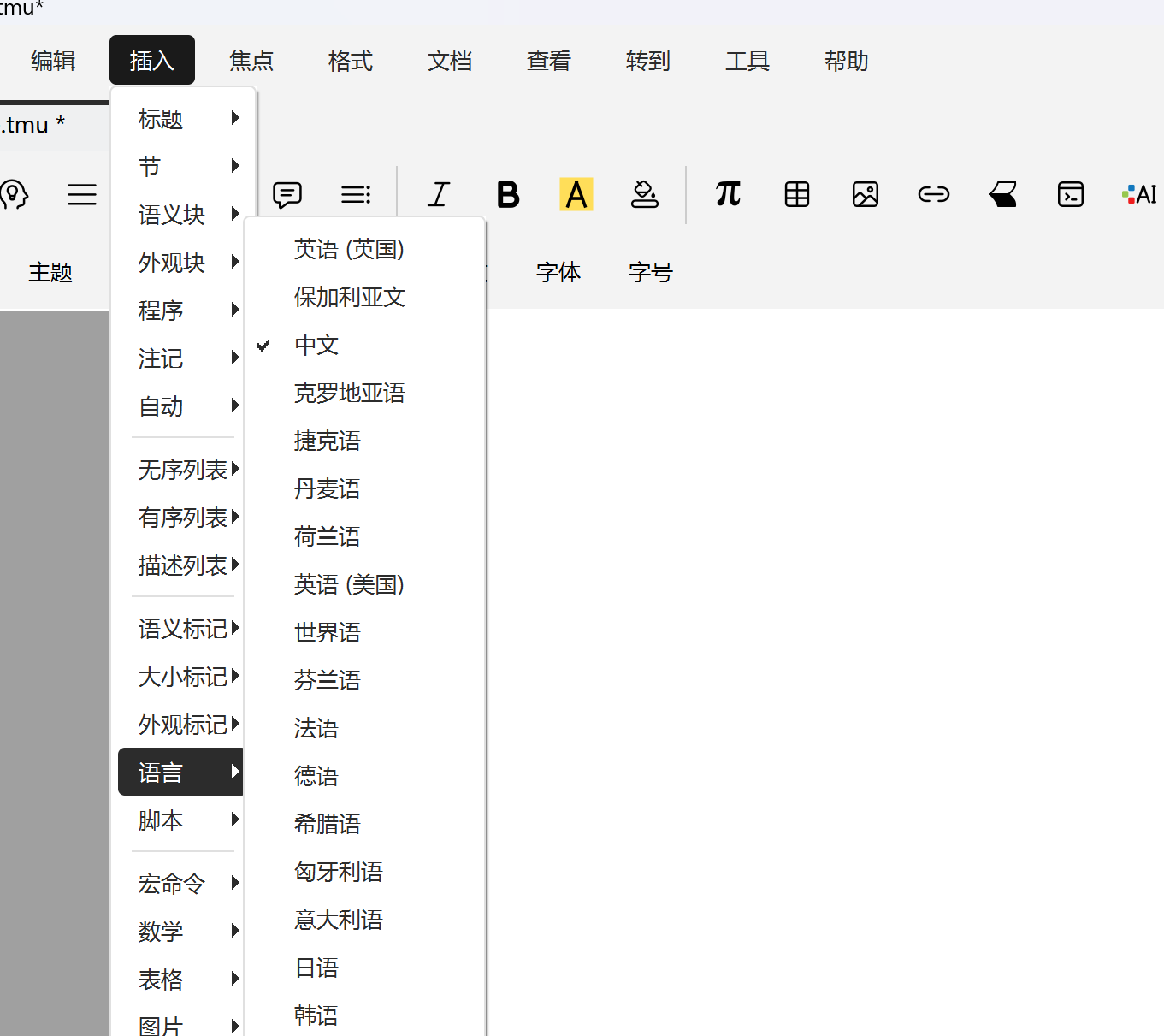 如果您需要在局部修改语言,您可以在菜单栏依次点击 插入