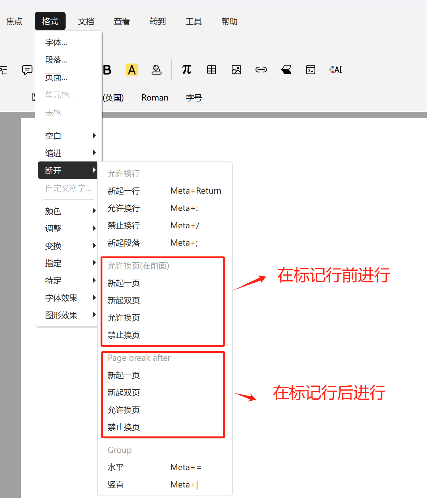 与分行的情况一样,您可以在文档中的特定点强制或禁止分页。此类指令通过标记来指示。您还可以指定希望该指令在标记所在行之前还是之后生效。具体方式如下:
