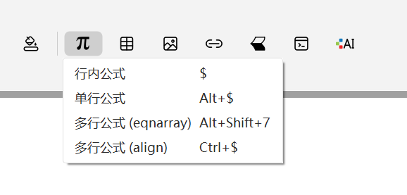 在模式工具栏依次点击 插入数学→单行/行内公式。