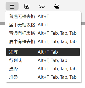 在任意公式环境内,Alt+t(此时会生成一个表格),+Tab(此时变形为矩阵)。多次 Tab 可以继续变形为行列式,Bmatrix,分段函数,Stack 下标等。